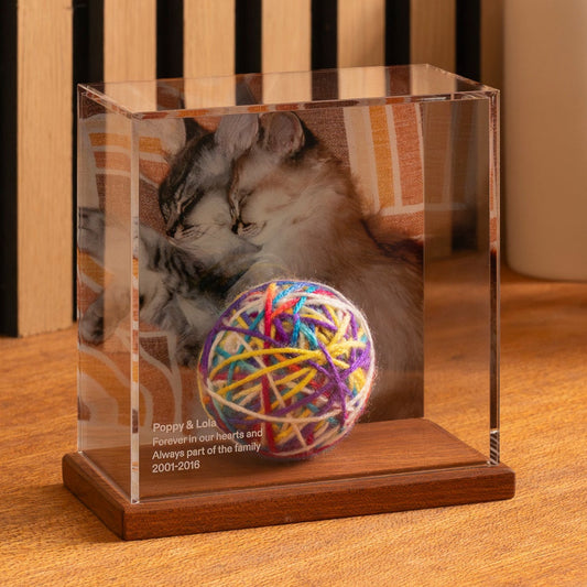 Each case includes a premium acrylic display case with solid wood base, your chosen background image, personalised engraving, and a mini envelope with letter card inside.